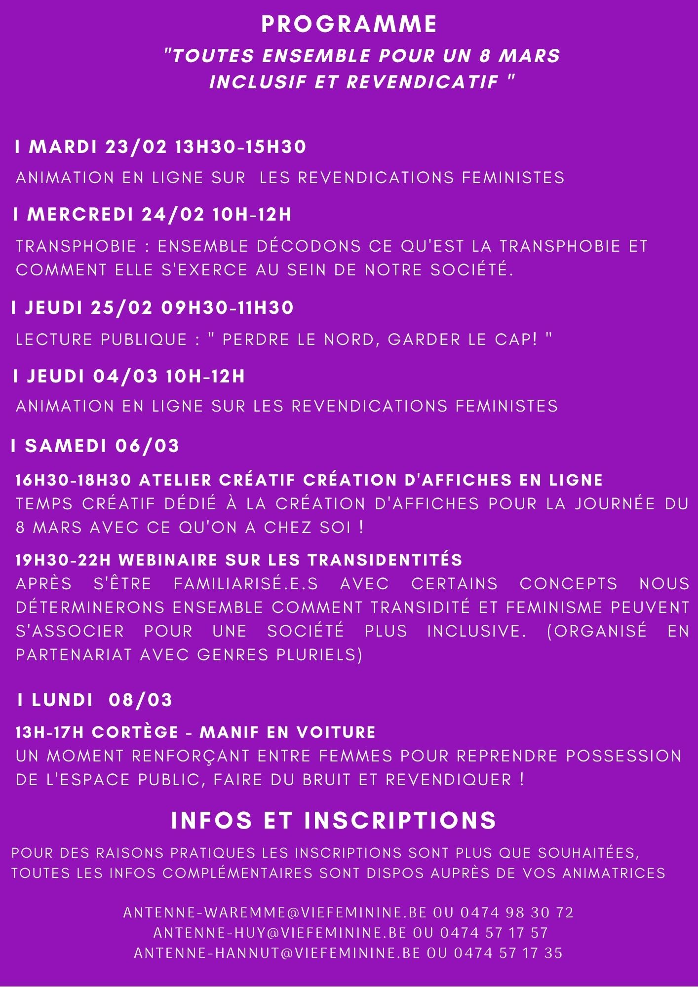 Pour le 8 mars 2021, Vie Féminine Huy-Waremme t’invite à participer à notre manifestation en voiture.